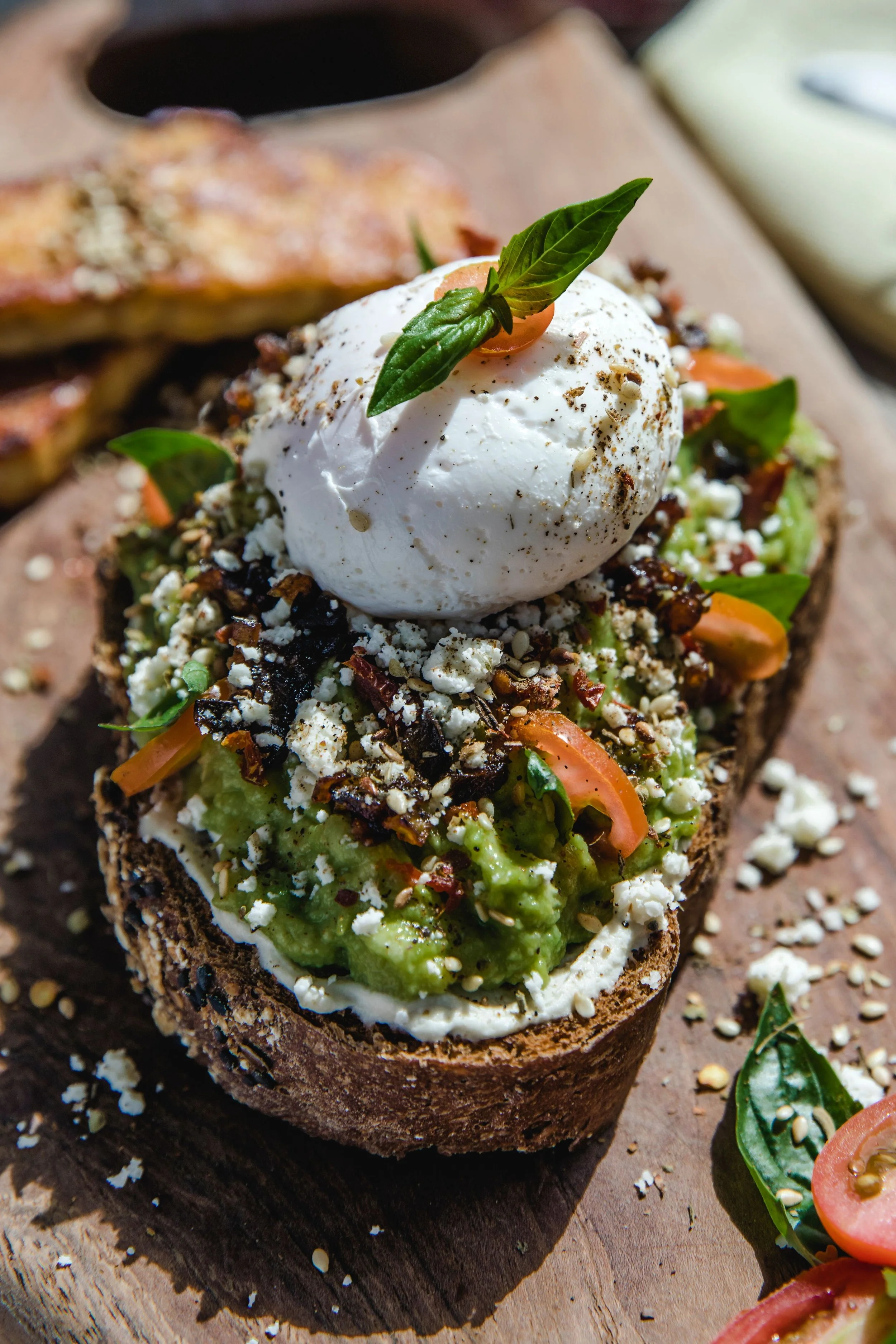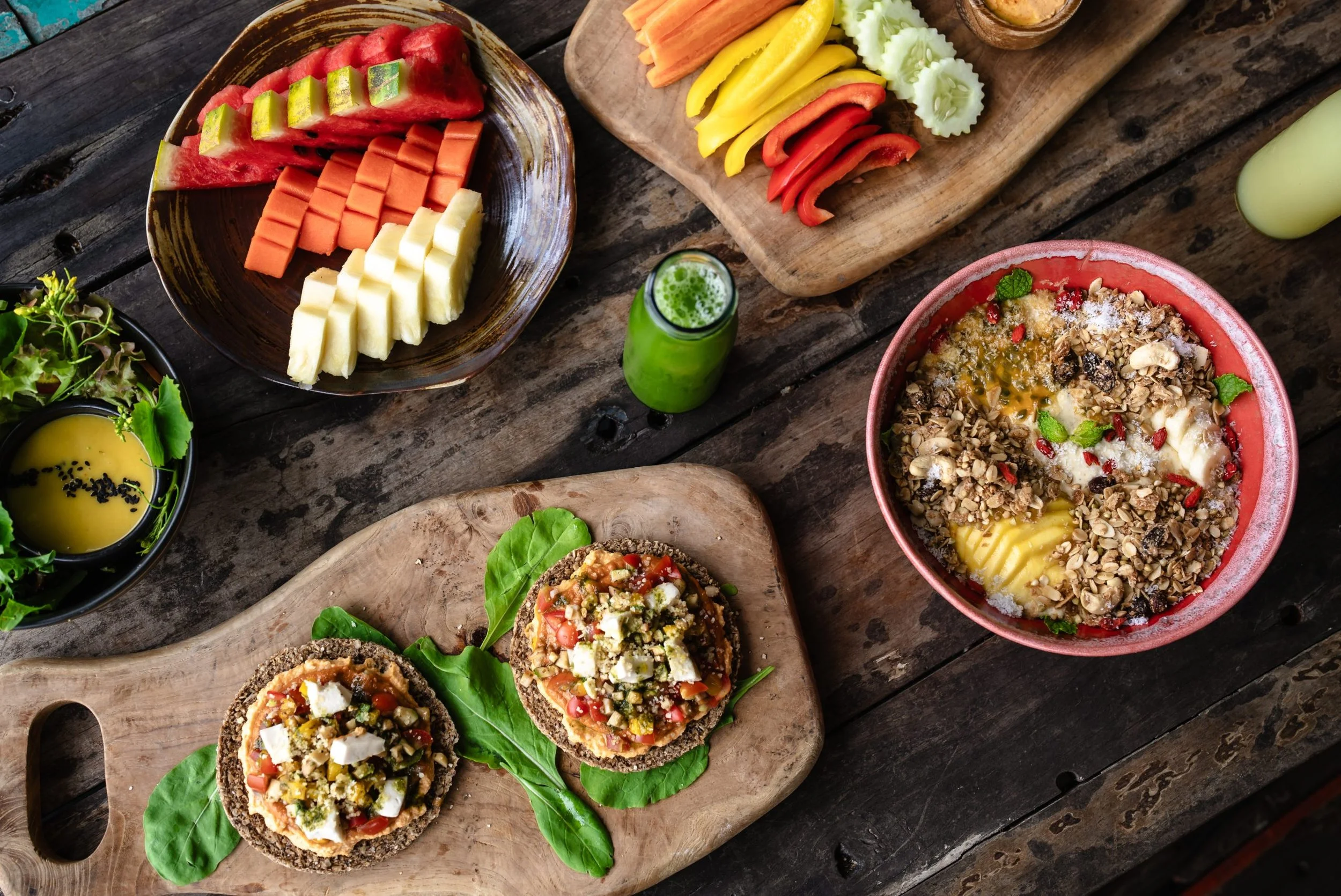 Brunch features fresh juices, tea and coffee, eggs or tofu, sourdough toast, muesli or chia pudding, vegetables with organic dips, salads, and tropical fruits.
